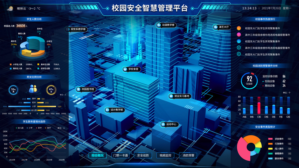 全方位立體式還原院區(qū)實貌,分圖層對院區(qū)的區(qū)域、建筑、單位、安防設備、管理設備、警情等進行查看、監(jiān)控和跟蹤;通過院區(qū)各類安防管理設備實時獲取各重點監(jiān)控區(qū)域的監(jiān)控數(shù)據(jù),對各種突發(fā)事件進行報警。通過人臉識別、車牌識別、行為識別、武器管理、營區(qū)設備等各類傳感器,對人、車、物及其行為的全面感知,保障營區(qū)安全。 -