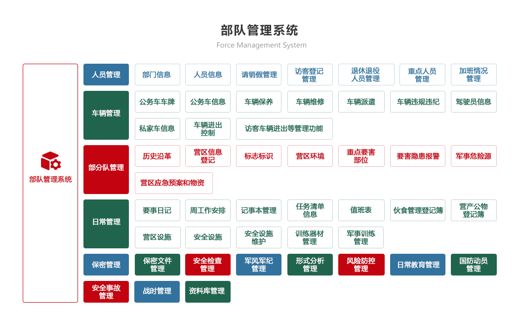 包含通知公告、部隊要訊、公文辦理、值班交班、工作計劃、文化共享、即使通訊、文件打印功能模塊。