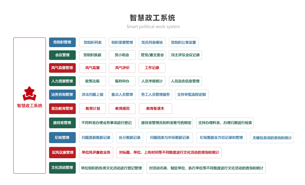 包含控制臺、組織架構、黨建動態(tài)、黨員學習、組織活動、志愿服務、黨費管理、監(jiān)督執(zhí)紀功能模塊。通過黨建在線學習教育,解決黨建學習難問題,實現(xiàn)便捷化管理;黨務工作流程及黨建資訊全掌握、黨建工作全方位可視,統(tǒng)一數(shù)據(jù)標準,智能分析績效考評,成績一目了然,做到數(shù)據(jù)指標化;積極推進黨建工作高效完成,信息高效處理。